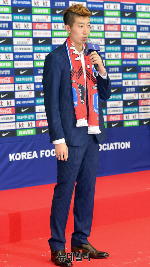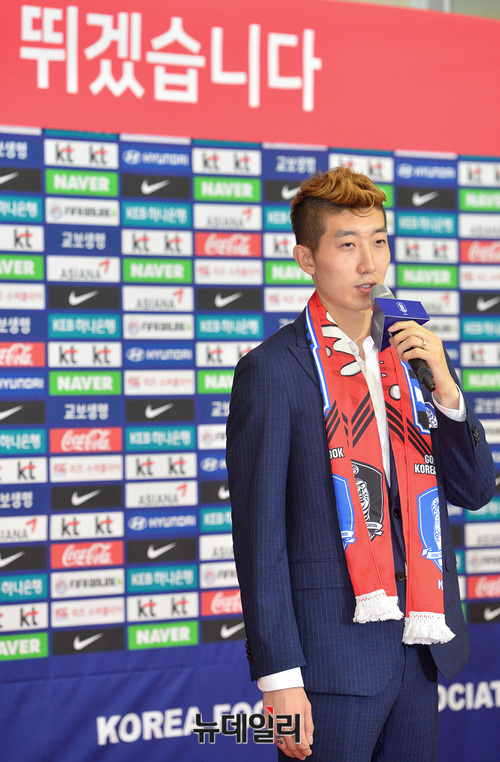 축구 대표팀 조현우가 29일 오후 인천국제공항 제2여객터미널에서 귀국 후 열린 해단식에 참석해 인사말을 하고 있다. 대표팀은 1승2패(스웨덴 0대1, 멕시코 1대2, 독일 2대0)로 16강 진출에 실패했다. (인천=뉴데일리 공준표 기자)