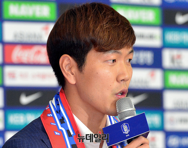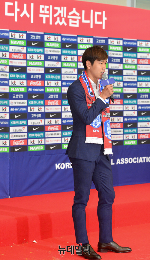 축구 대표팀 김영권이 29일 오후 인천국제공항 제2여객터미널에서 귀국 후 해단식에 참석해 인사말을 하고 있다. 대표팀은 1승2패(스웨덴 0대1, 멕시코 1대2, 독일 2대0)로 16강 진출에 실패했다. (인천=뉴데일리 공준표 기자)