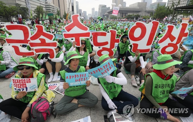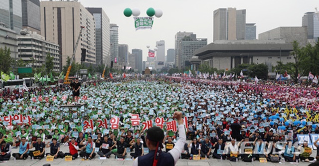 전국민주노총조합총연맹(이하 민노총)이 서울 도심에서 문재인 정부의 최저임금법 개정안 폐기와 비정규직 철폐 등을 촉구하며 대규모 집회를 열었다.민노총은 30일 오후 3시 서울 종로구 광화문광장에서 '최저임금삭감법 폐기 하반기 총파업 총력투쟁 선포 및 6·30 비정규직 철폐 전국노동자대회'를 열었다.이날 집회에는 경찰 추산 4만 명, 주최 측 추산 8만명의 인원이 운집한 것으로 전해졌다. 문재인 정부 출범 이후 열린 집회 중 최대규모다.민노총은 이번 집회를 통해 최저임금 산입범위를 확대하는 내용의 최저임금법 개정안이 국회를 통과해 최저임금 인상 효과를 무력화 시켰다고 주장했다.또 정부가 주 52시간 노동시간 단축과 관련하여 6개월 계도 기간을 설정한 것을 두고 문 정부의 노동정책이 급속히 후퇴한 것이라고 강력 반발했다.김명환 민주노총 위원장은 이에 대해 "새로운 정부가 들어서서 노동존중 세상을 만들겠다고 공표한 사실을 주목했다"며 "하지만 그로부터 1년이 지났는데도 노동존중은 어디 간데없고 도리어 공약은 사라지고 후퇴하고 있다"고 주장했다.금속노조 김호규 위원장 역시 "우리가 투쟁을 멈추지 못하는 이유는 아직도 간절히 바라는 노동자의 권리가 노동존중사회가 말로 아닌 투쟁밖에 없기 때문"이라면서 "이제 한 갈래 길 밖에 없다. 앞으로는 면담 요청 하지 않고 요구조건도 내걸지 말아야 한다. 말이 안 되면 몽둥이와 투쟁으로 우리의 갈길을 만들어 나가야 한다"고 호소했다.이후 참석자들은 "우리의 투쟁은 이제부터" "최저임금삭감법 반드시 폐기시키자" "노동적폐 끝장내자"는 구호를 외치며 '최저임금 삭감법', '취업규칙 불이익 변경', '말로만 노동존중'등의 글귀가 담긴 얼음을 부수는 의식을 단행했다.