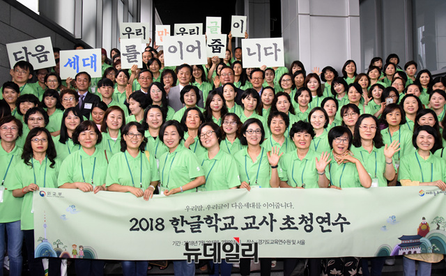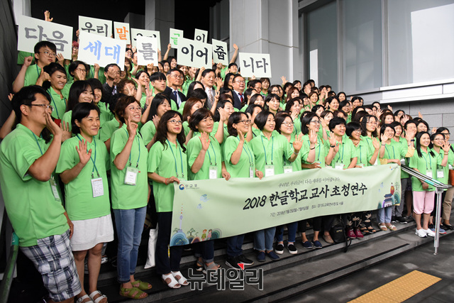 '2018 한글학교 교사 초청연수'에 참가한 교사들이 2일 오전 서울 대한민국역사박물관 야외 계단에서 재외한글학교 교사의 역할을 알리는 '우리말 우리글이 다음 세대를 이어줍니다' 카드섹션 퍼포먼스를 하고 있다.