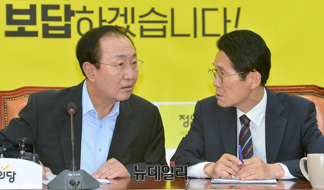 노회찬 정의당 원내대표와 윤소하 의원이 3일 오전 국회에서 열린 의원총회에 참석해 대화를 나누고 있다.