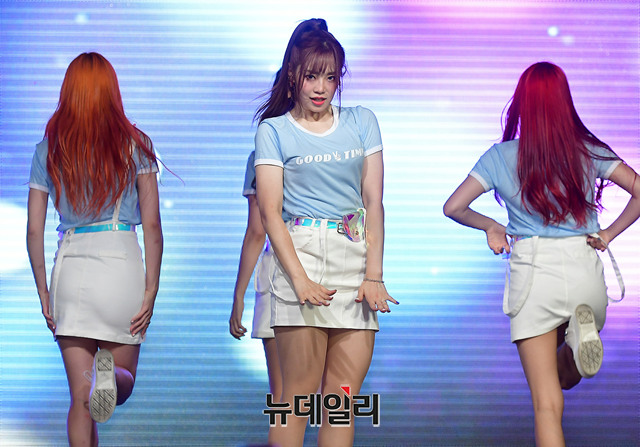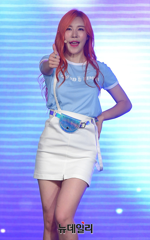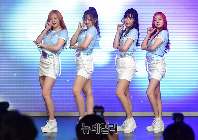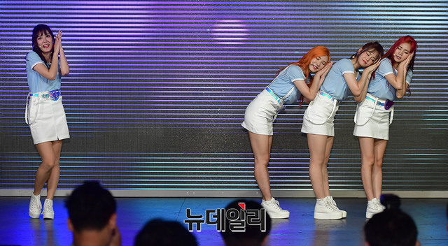 걸그룹 플래쉬(나래, 세령, 예린, 민서)가 3일 오후 서울 강남구 강남관광정보센터에서 데뷔 5년 만에 연 쇼케이스에서 타이틀곡 '베이비로션' 무대를 선보이고 있다.