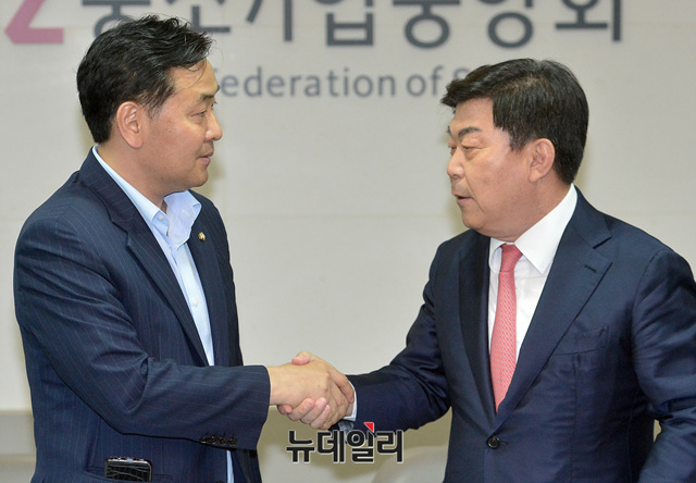김관영 바른미래당 원내대표가 3일 오후 서울 여의도 중소기업중앙회를 예방해 박성택 중소기업중앙회장과 악수를 나누고 있다.