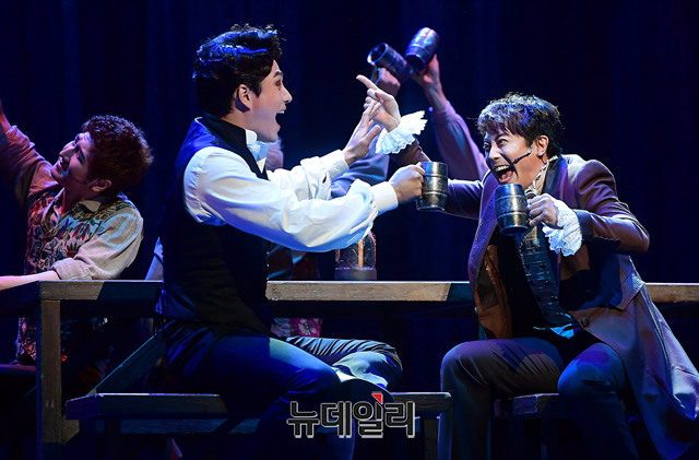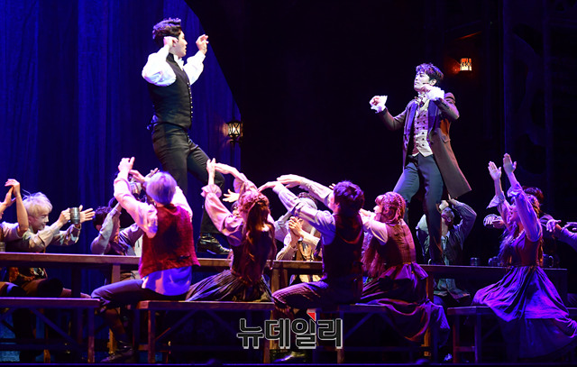 배우 민우혁, 한지상이 3일 오후 서울 용산구 블루스퀘어에서 뮤지컬 '프랑켄슈타인' 쇼케이스에서 하이라이트 장면을 시연하고 있다.