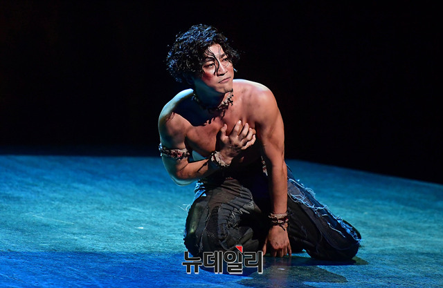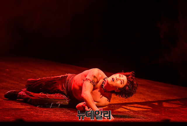 배우 박민성이 3일 오후 서울 용산구 블루스퀘어에서 뮤지컬 '프랑켄슈타인' 쇼케이스에서 하이라이트 장면을 시연하고 있다.