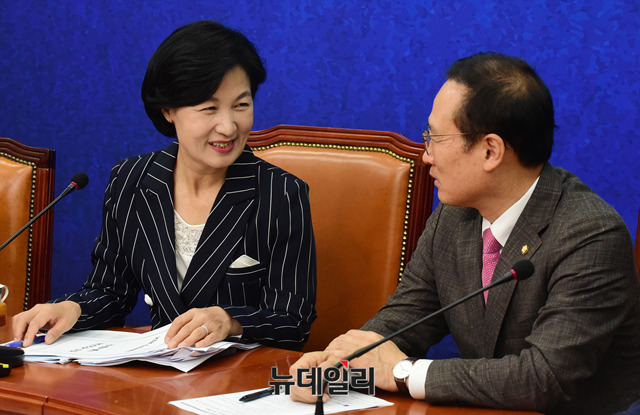추미애 더불어민주당 당대표가 4일 오전 국회 당 대회의실에서 열린 최고위원회의에서 홍영표 원내대표와 대화를 나누고 있다.