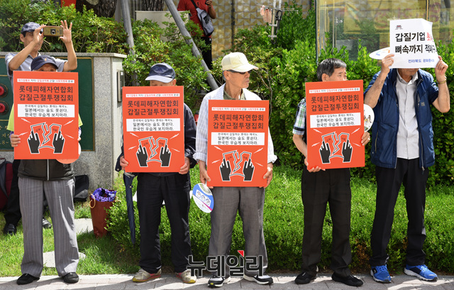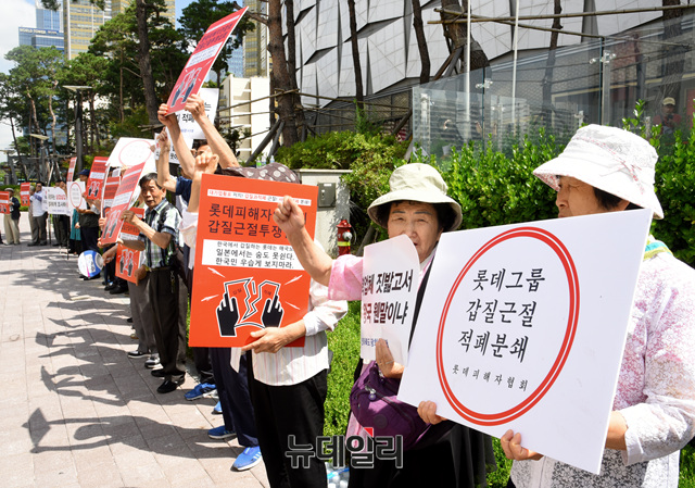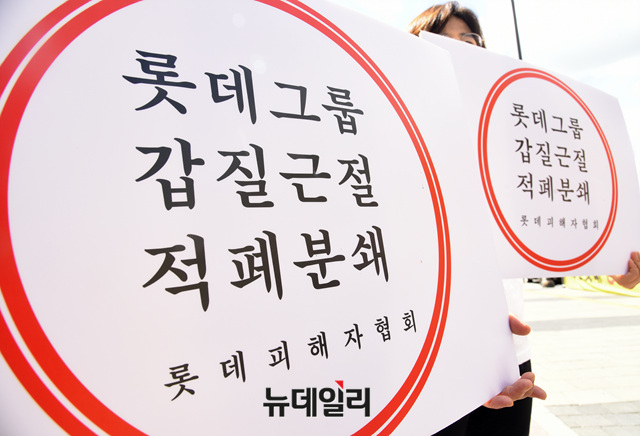 롯데피해자협회가 4일 오전 서울 송파구 롯데월드타워 앞에서 '롯데그룹 갑질근절'을 촉구하는 시위를 하고 있다.
