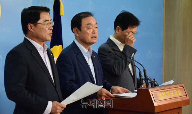 장병완 민주평화당 원내대표, 천정배 의원, 최경환 의원이 4일 오전 국회 정론관에서 미국의 수입자동차 및 부품 무역확장법 232 적용에 대한 정부의 적극적 대처 촉구 기자회견을 하고 있다.