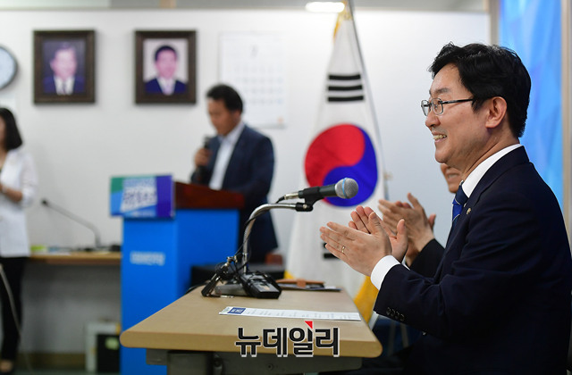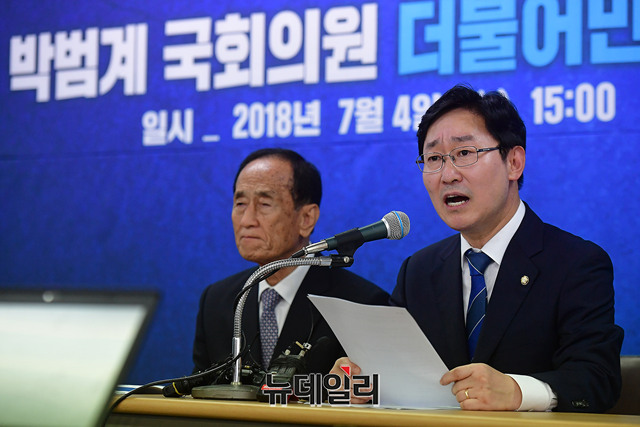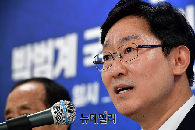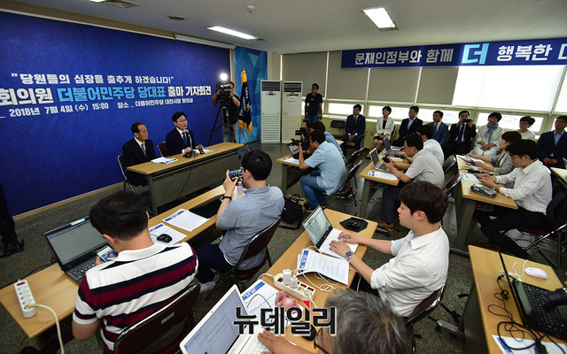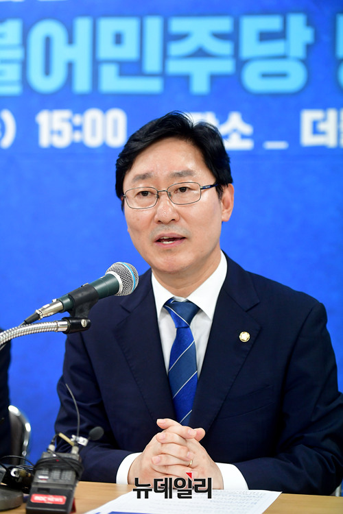 박범계 더불어민주당 의원이 4일 오후 대전 중구 대전광역시당에서 신임 당대표 출마와 관련해 기자회견을 갖고 있다. 앞서 박 의원은 이날 오전 국회 정론관에서 출마선언을 했다.