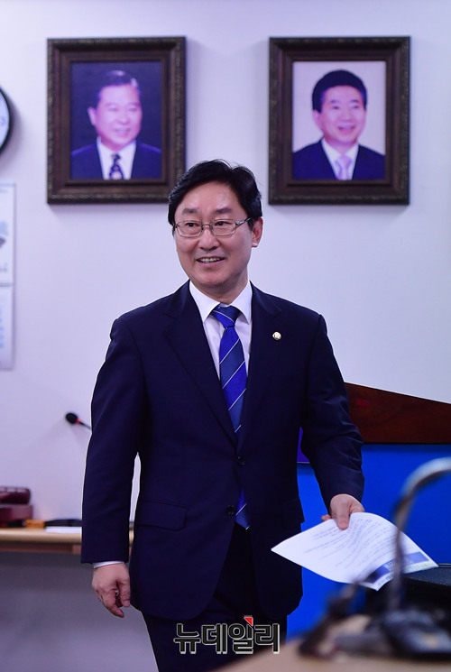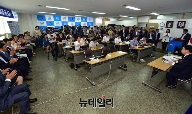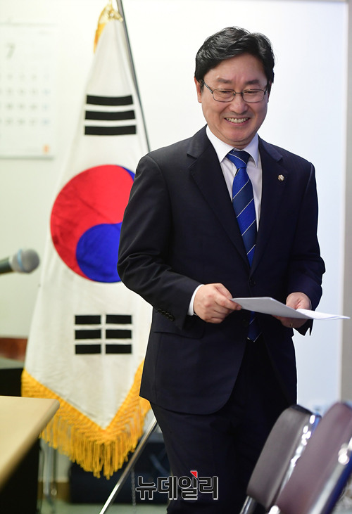 박범계 더불어민주당 의원이 4일 오후 대전 중구 대전광역시당에서 열린 신임 당대표 출마 기자회견에 입장하고 있다. 박 의원은 앞서 이날 오전 국회 정론관에서 출마선언을 했다.