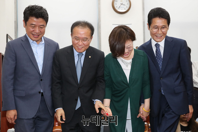 바른미래당 유의동, 자유한국당 윤재옥, 더불어민주당 진선미, 평화와정의의의원 모임 윤소하 원내수석부대표(왼쪽부터)가 4일 오후 국회에서 4개 교섭단체 회동 직전 포토타임을 갖고 있다.