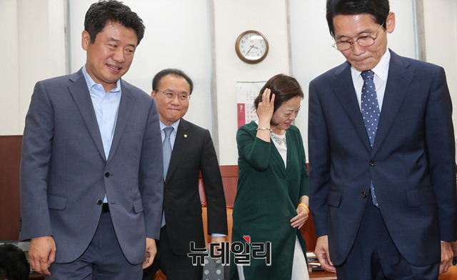 여야 4당 원내수석부대표(바른미래당 유의동, 자유한국당 윤재옥, 더불어민주당 진선미, 평화와정의의의원 모임 윤소하 원내수석부대표)가 4일 오후 국회 자유한국당 원내수석부대표실에서 회동을 갖고 있다.