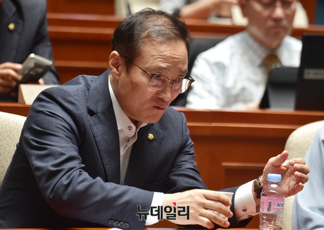 홍영표 더불어민주당 원내대표가 5일 오전 국회에서 열린 의원총회에서 물을 마시고 있다.