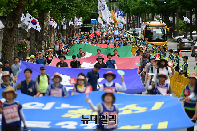 전교조가 6일 오후 청와대 인근 도로에서 '법외노조취소'와 '노동3권'을 요구하는 결의대회를 진행하고 있다.