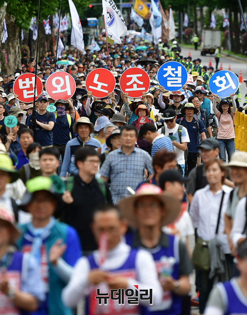 전교조가 6일 오후 청와대 인근 도로에서 '법외노조취소'와 '노동3권'을 요구하는 결의대회에서 구호를 외치고 있다.