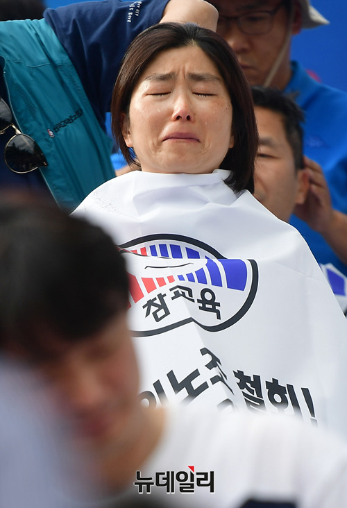 전교조 결의대회에 참석한 한 교사가 6일 오후 청와대 사랑채 앞 인근 도로에서 삭발을 하며 눈물을 흘리고 있다. 이날 결의대회 말미에 진행한 삭발식에는 전교조 교사 40명이 참석했다.