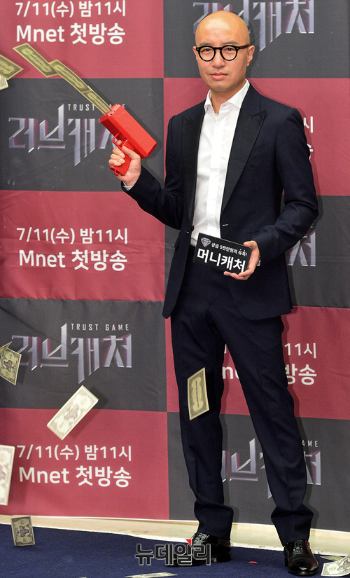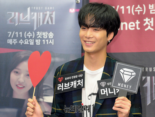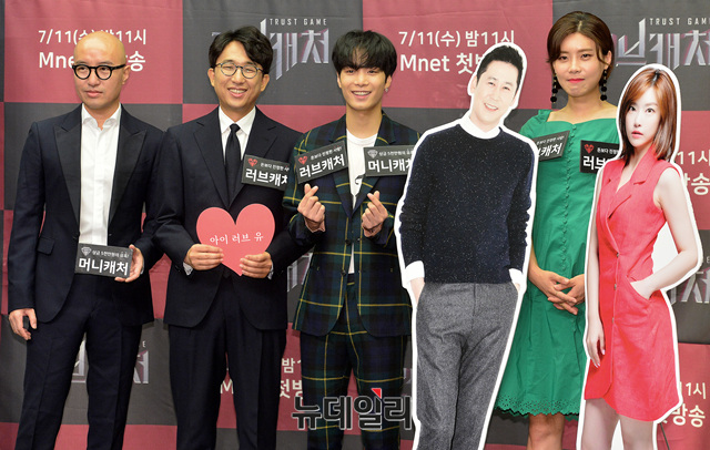 예능 프로그램 '러브캐처' 출연자들(홍석천, 장도연, 전건우, 뉴이스트W JR)이 9일 오전 서울 마포구 스탠포드호텔에서 열린 제작발표회에 참석해 포즈를 취하고 있다.