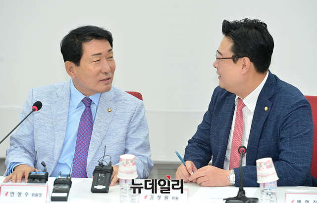 안상수 자유한국당 혁신 비상대책위원회 준비위원장과 김성원 준비위원이 10일 오전 국회에서 열린 혁신 비상대책위원회 구성을 위한 준비위원회 4차 회의에 참석해 대화를 나누고 있다.