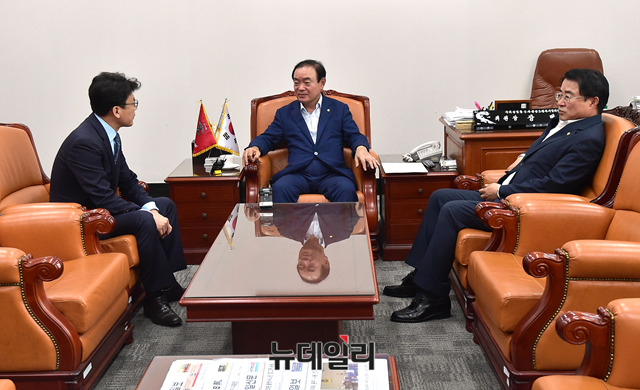 장병완 민주평화당 원내대표가 10일 오후 국회에서 진성준 서울시 정무부시장 예방을 받고 대화를 나누고 있다.