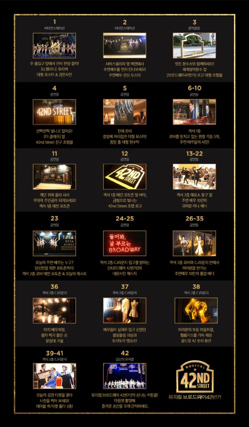 뮤지컬 '브로드웨이 42번가'는 1930년대 대공황기 브로드웨이를 배경으로 무명 코러스걸 페기 소여가 뮤지컬 스타로 탄생하는 이야기를 담는다. 배우 김석훈, 이종혁, 배해선, 김선경, 오소연, 정단영, 이경미, 홍지민, 정민, 강동호 등이 출연한다.