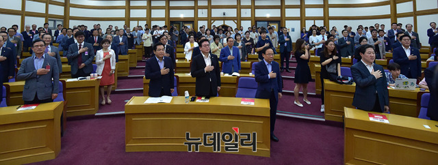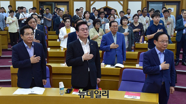 심재철, 정우택, 이주영(왼쪽부터) 등 자유한국당 의원이 11일 오전 국회 의원회관에서 열린 '보수정당, 어떻게 재건할 것인가?' 토론회에 참석해 국민의례를 하고 있다.
