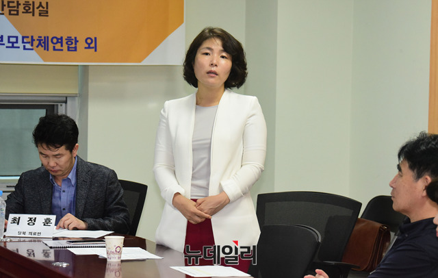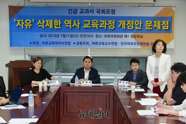 전희경 자유한국당 의원이 11일 국회 의원회관에서 열린 '자유를 삭제한 역사 교육과정 개정안의 문제점'을 주제로 교과서 포럼에서 인사말을 하고 있다.