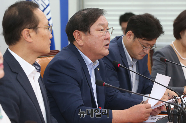 김태년 더불어민주당 정책위의장이 12일 오전 국회에서 열린 정책조정회의에서 모두발언을 하고 있다.