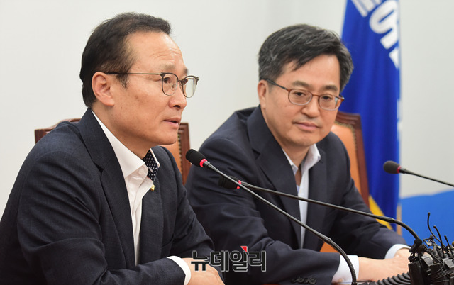 홍영표 더불어민주당 원내대표가 12일 오전 국회를 찾은 김동연 경제부총리 겸 기획재정부 장관에게 인사말을 하고 있다.
