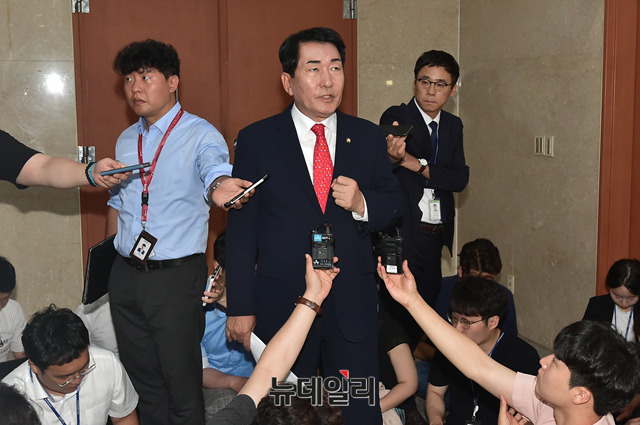 안상수 자유한국당 혁신 비상대책위원회 준비위원장이 12일 오후 국회 정론관에서 5인으로 압축한 비대위원장 후보 발표 후 기자들의 질문에 답하고 있다.