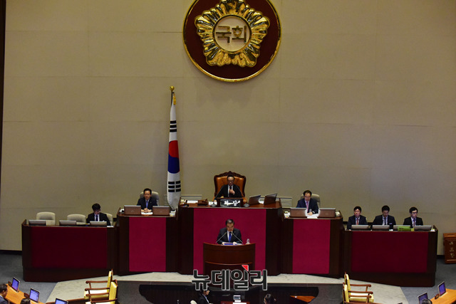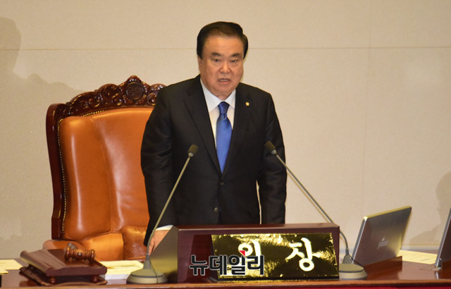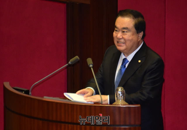 더불어민주당 문희상 의원(6선·경기 의정부갑)이 13일 오전 국회 본회의에서 20대 국회 후반기를 이끌 신임 국회의장으로 선출된 직후 당선사를 밝히고 있다.