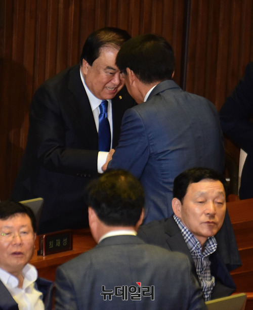 문희상 더불어민주당 의원(6선·경기 의정부갑)이 13일 오전 국회 본회의에서 20대 국회 후반기를 이끌 신임 국회의장으로 선출된 직후 동료의원들에게 축하를 받고 있다.