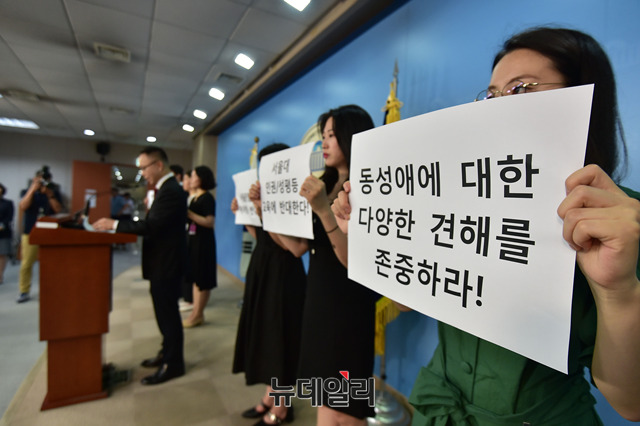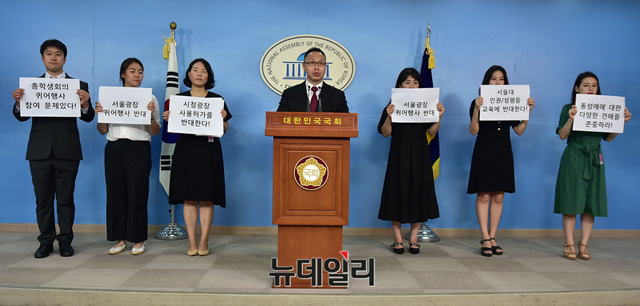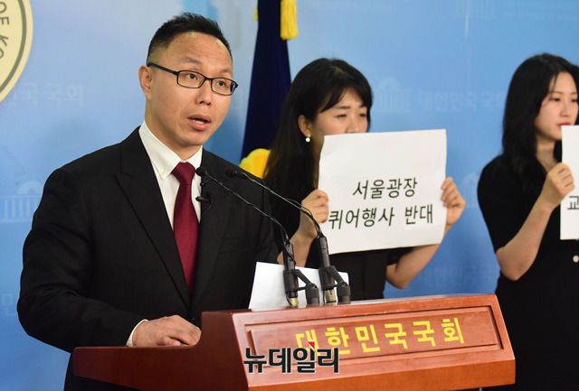 트루스포럼 연합회 회원들이 13일 오후 국회 정론관에서 서울광장 퀴어(동성애 행사)축제 반대 성명서를 발표하고 있다.