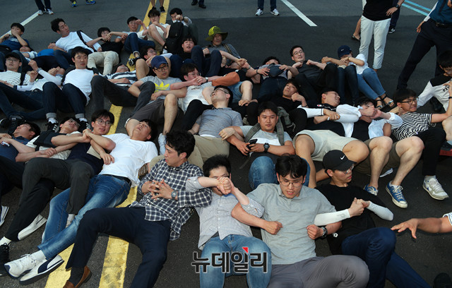 퀴어(동성애)축제를 반대하는 시민들이 14일 오후 을지로 일대에서 퀴어퍼레이드 행렬에 맞서 도로에 누워있다.