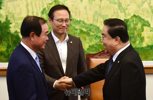 문희상 신임 국회의장이 16일 오전 국회의장실에서 열린 4당 교섭단체 원내대 회동에서 홍영표 더불어민주당 원내대표와 인사를 나누고 있다.