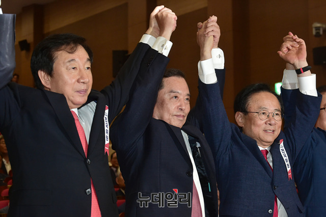 김병준 자유한국당 혁신비대위원장, 김성태 대표 권한대행 겸 원내대표 등이 17일 오전 국회 의원회관에서 열린 제2차 전국위원회에서 함께 손을 들어 인사하고 있다.