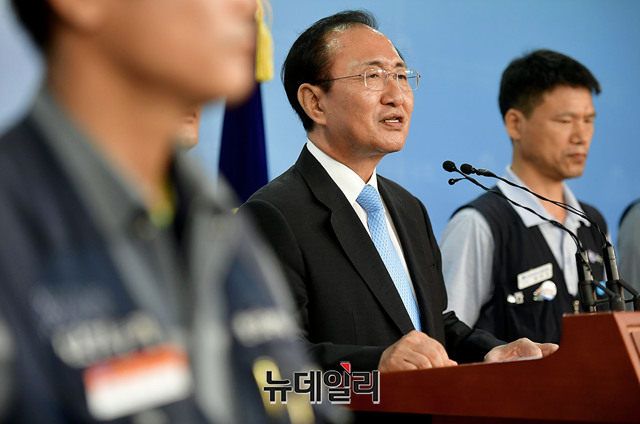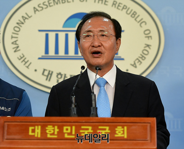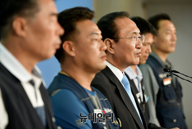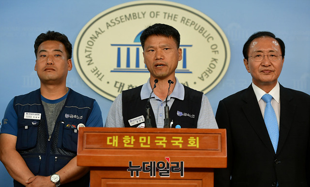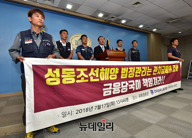 노회찬 정의당 원내대표와 성동조선해양 금속노조 관계자들이 17일 오후 국회 정론관에서 기자회견을 열고 "성동조선해양 법정관리와 관련해 금융당국이 책임져야 한다"고 주장했다.