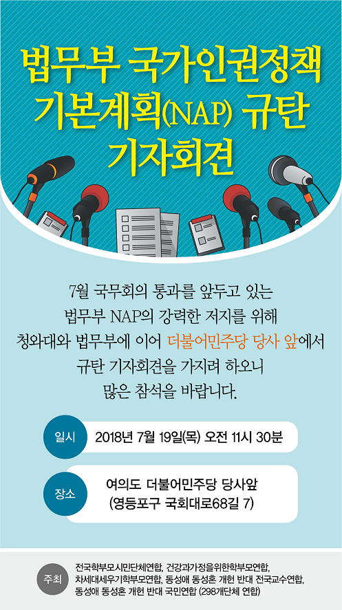 동성애동성혼개헌반대국민연합(이하 국민연합)은 18일 성명을 내고 "법무부가 수립한 기본계획에는 성평등 정책 등 현행법을 위배하는 내용이 가득하다"며 19일 오전 11시 30분 여의도에 위치한 더불어민주당 당사 앞 기자회견을 예고했다.
