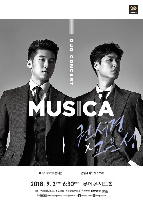 베이스바리톤 권서경과 뮤지컬 배우 고은성이 앨범 'Musica' 발매 기념 첫 듀오 콘서트를 갖는다.9월 2일 오후 6시 30분 롯데콘서트홀에서 열리는 'Musica(뮤지카)'는 듀오로서 선보이는 첫 번째 공연이다. 지난해 9월 2일 기부 콘서트 'My Opera, My Musical' 이후 딱 일년 만에 함께 무대에 오른다.권서경과 고은성은 JTBC '팬텀싱어 1'에서 에스프레소처럼 진하고 강렬한 음악을 선보이겠다는 '흉스프레소'의 멤버로 활약했다. 특히, 'Musica'라는 곡은 영상 조회 100만 회를 넘겼다.앨범 'Musica'는 '팬텀싱어'를 통해 인연을 맺은 음악 감독 권태은이 총 프로듀서로 참여했다. 권태은 감독은 노을의 '청혼', '전부 너였다', 비의 '태양을 피하는 방법', 'It’s Raining' 등 국내 인기 가수들의 음반에 작·편곡 및 프로듀서를 맡았다.두 사람은 처음 발표한 앨범이자 첫 콘서트이기에 남다른 애정과 감사의 마음을 가지고 준비하고 있다. 이에 앨범에 수록된 곡뿐만 아니라 다채로운 곡들로 무대를 꾸밀 예정이다.이번 앨번의 유일한 신곡이자 섬세한 발라드 곡 '제자리표'를 비롯해 'Musica', 'It hurts to say goodbye', 'D’istinto e di cuore', '청혼' 등을 노래한다.