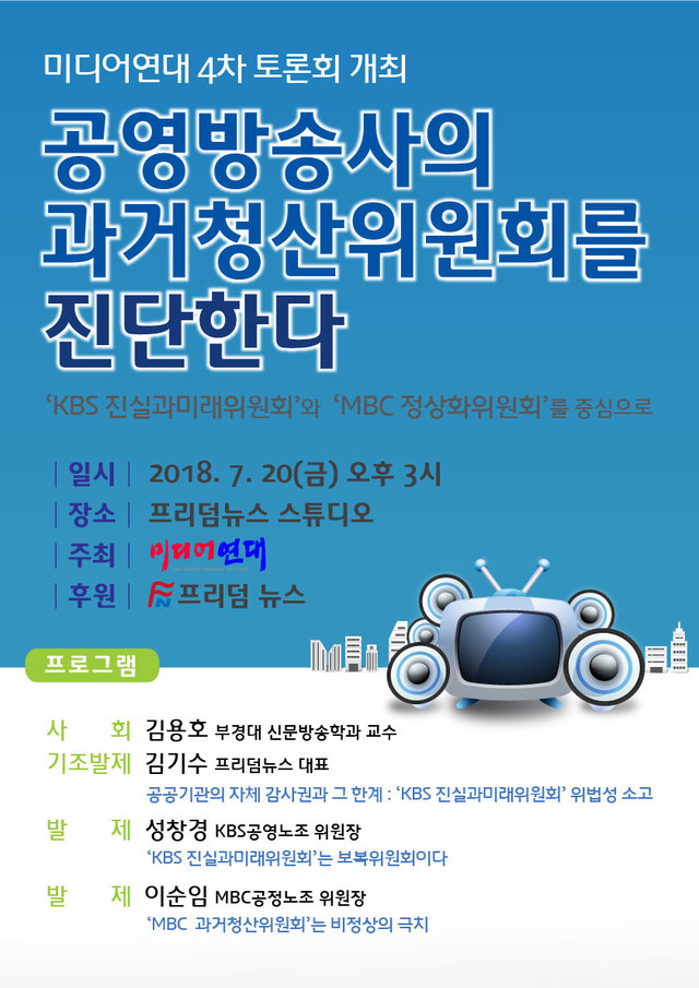 오는 20일 오후 3시 서울 종로구 소재 프리덤뉴스 스튜디오에서 열리는 이번 토론회는 『공영방송사의 과거청산위원회를 진단한다 - KBS진실과미래위원회와 MBC정상화위원회를 중심으로』라는 현안 주제를 갖고, 김기수 프리덤뉴스 대표와 성창경 KBS공영노조 위원장, 이순임 MBC공정노조 위원장 등이 발제자로 나서 열띤 토론을 벌일 예정이다.