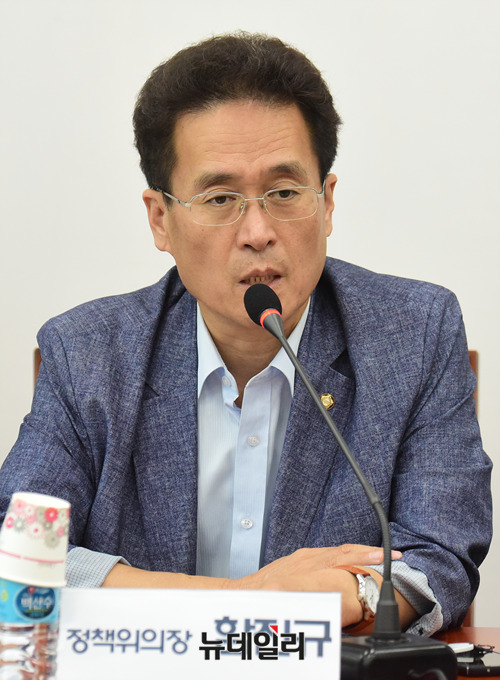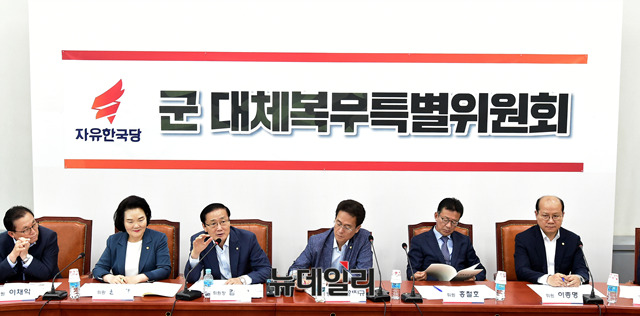 함진규 자유한국당 정책위의장이 19일 오후 국회에서 열린 방의무의 형평성에 어긋나지 않는 군 대체복무 방안을 모색하기 위한 자유한국당 군 대체복무특별위원회 토론회에서 인사말을 하고 있다.