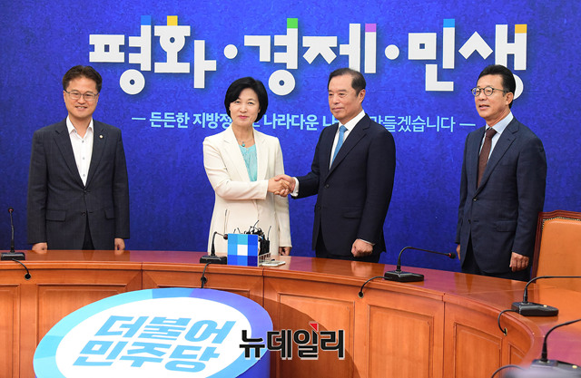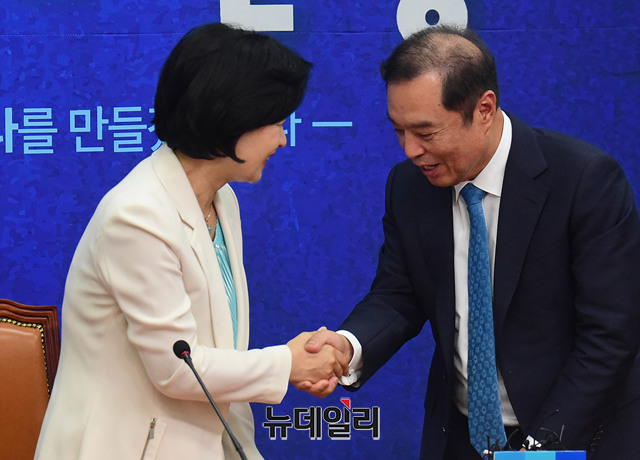 김병준 자유한국당 비상대책위원장이 20일 오전 국회에서 추미애 더불어민주당 대표을 예방해 악수를 나누고 있다.