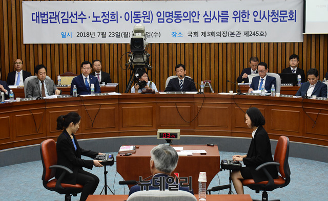 김선수 대법관 후보자가 23일 오전 국회에서 열린 인사청문회에서 의원들의 질문에 답하고 있다.