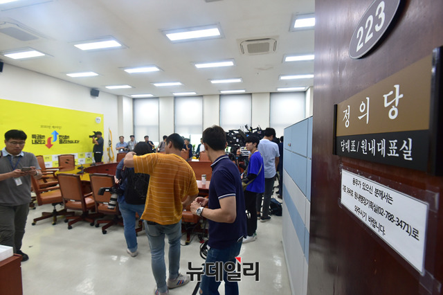 불법 정치자금을 받았다는 의혹을 받은 노회찬 정의당 원내대표가 사망한 23일 오전 국회 정의당 대표, 원내대표실에서 취재진들이 회의실 내부를 취재하고 있다.