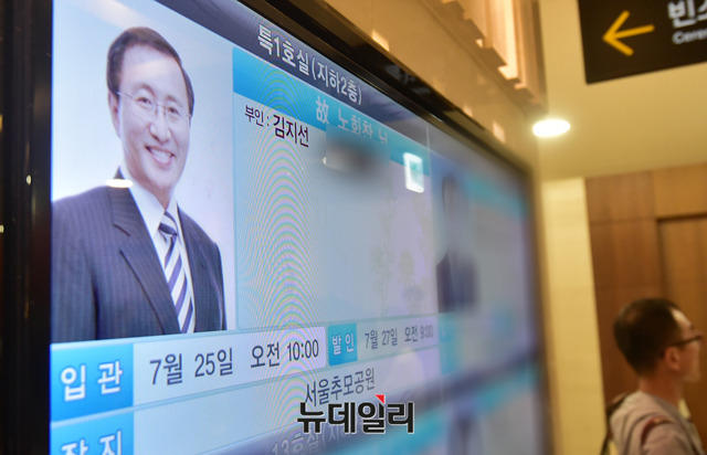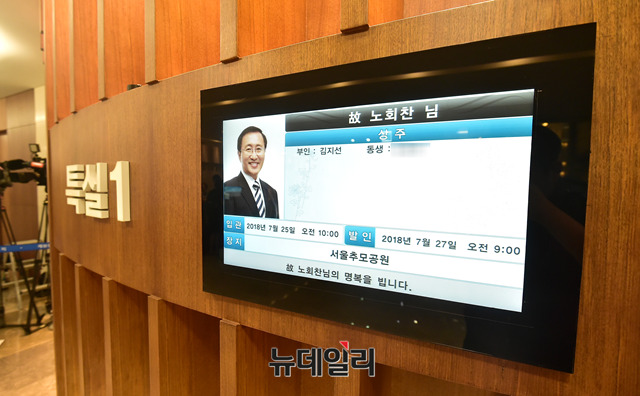 불법 정치자금을 받았다는 의혹을 받은 노회찬 정의당 원내대표가 사망한 23일 오후 서울 신촌 세브란스 병원 장례식장에 마련되고 있다.