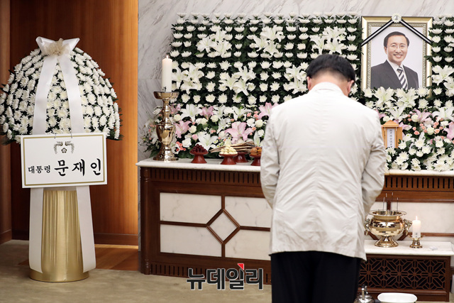노회찬 정의당 원내대표의 빈소가 23일 오후 서울 마포구 신촌세브란스병원 장례식장에 마련됐다. 노 원내대표는 앞서 서울 중구의 한 아파트에서 투신해 사망했다.