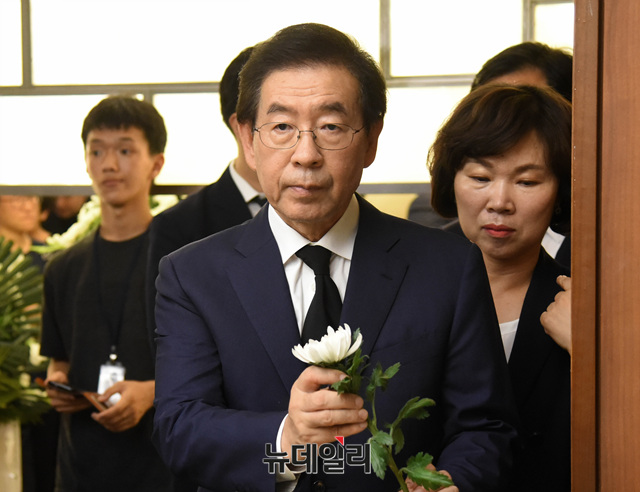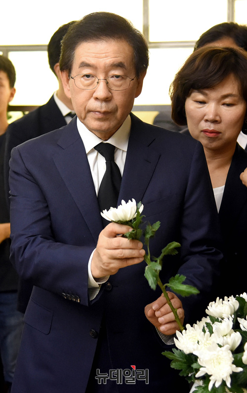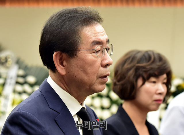 박원순 서울시장이 23일 오후 서울 마포구 신촌세브란스병원 장례식장에 마련된 노회찬 정의당 원내대표 빈소를 찾아 조문하고 있다. 노 원내대표는 앞서 서울 중구의 한 아파트에서 투신해 사망했다.