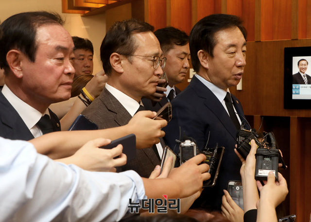 장병완 민주평화당, 홍영표 더불어민주당, 김성태 자유한국당, 김관영 바른미래당 원내대표가 23일 오후 서울 마포구 신촌세브란스병원 장례식장에 마련된 노회찬 정의당 원내대표 빈소를 찾아 조문 후 질문에 답하고 있다.