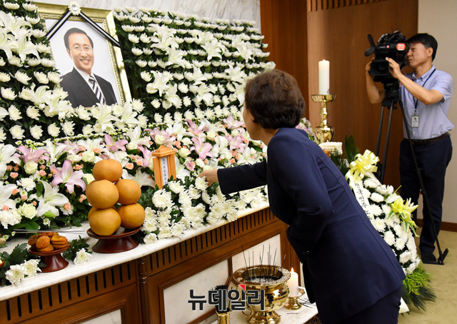 김현미 국통교통부 장관이 23일 오후 서울 마포구 신촌세브란스병원 장례식장에 마련된 노회찬 정의당 원내대표 빈소를 찾아 조문하고 있다. 노 원내대표는 앞서 서울 중구의 한 아파트에서 투신해 사망했다.