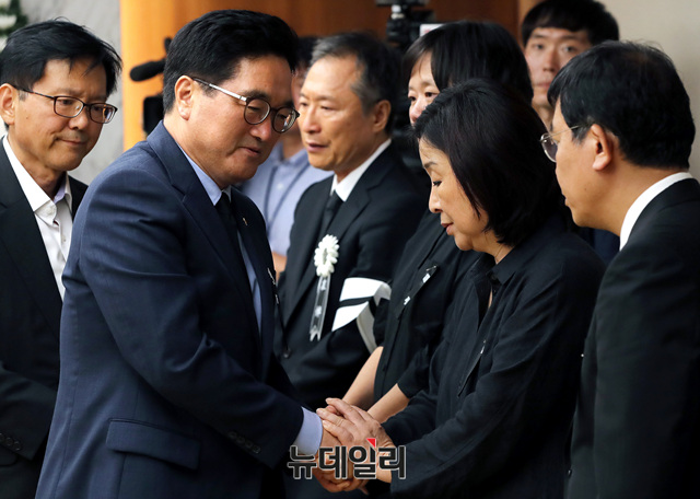 우원식 더불어민주당 의원이 23일 오후 서울 마포구 신촌세브란스병원 장례식장에 마련된 노회찬 정의당 원내대표 빈소를 찾아 조문하고 있다. 노 원내대표는 앞서 서울 중구의 한 아파트에서 투신해 사망했다.