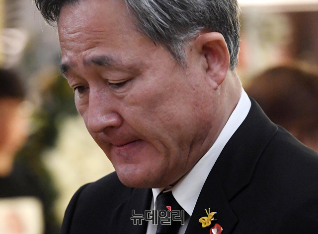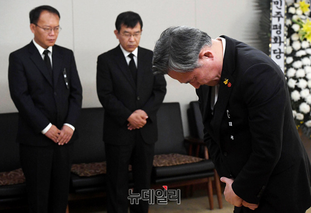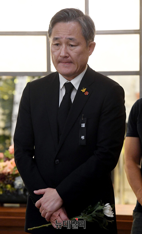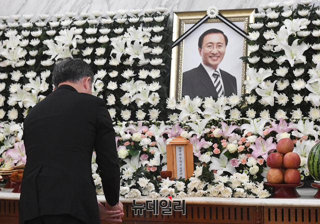 표창원 더불어민주당 의원이 24일 오전 서울 마포구 신촌세브란스병원 장례식장에 마련된 노회찬 정의당 원내대표 빈소를 찾아 조문하고 있다. 노 원내대표는 앞서 서울 중구의 한 아파트에서 투신해 사망했다.